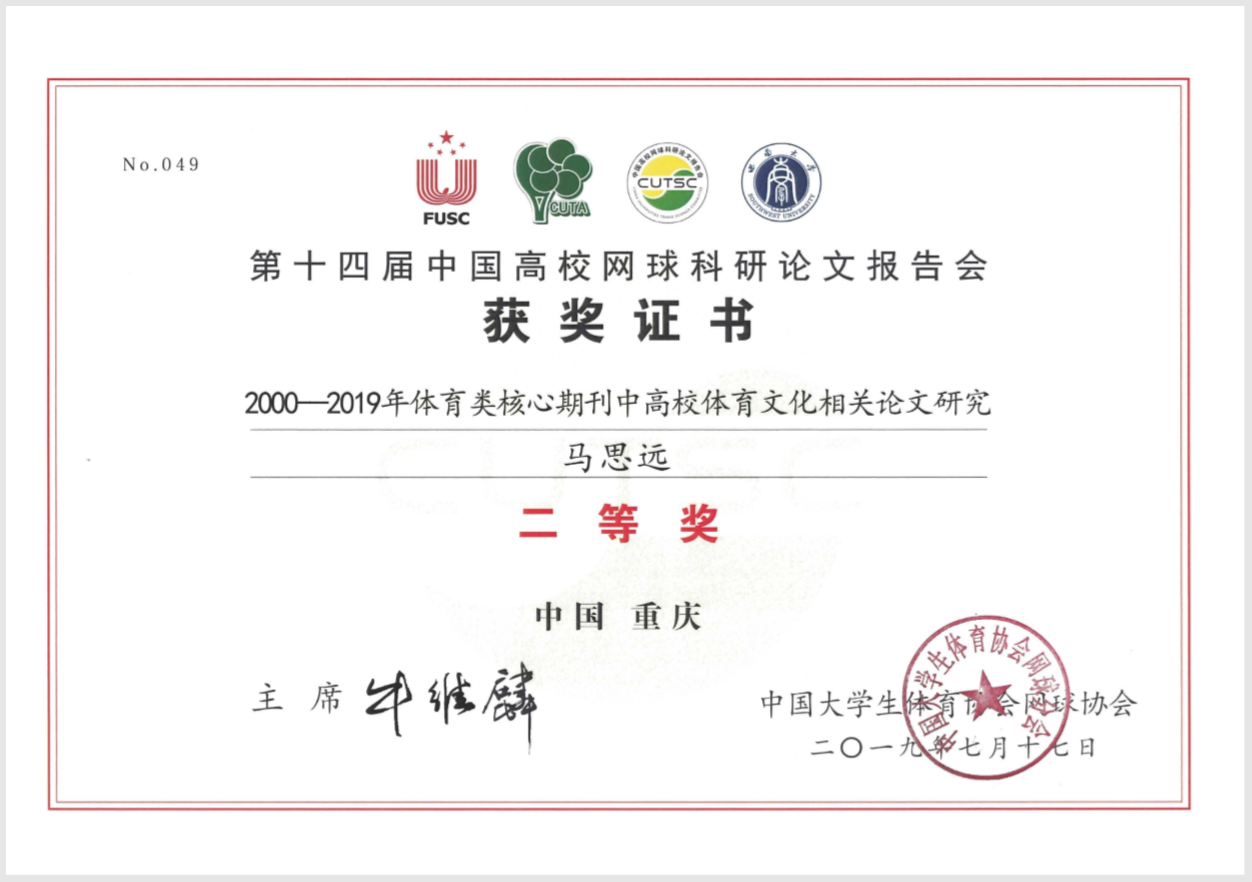 由中国大学生体育协会网球分会主办、西南大学承办的第十四届中国高校网球科研论文报告会于20197月1618日在西南大学举行