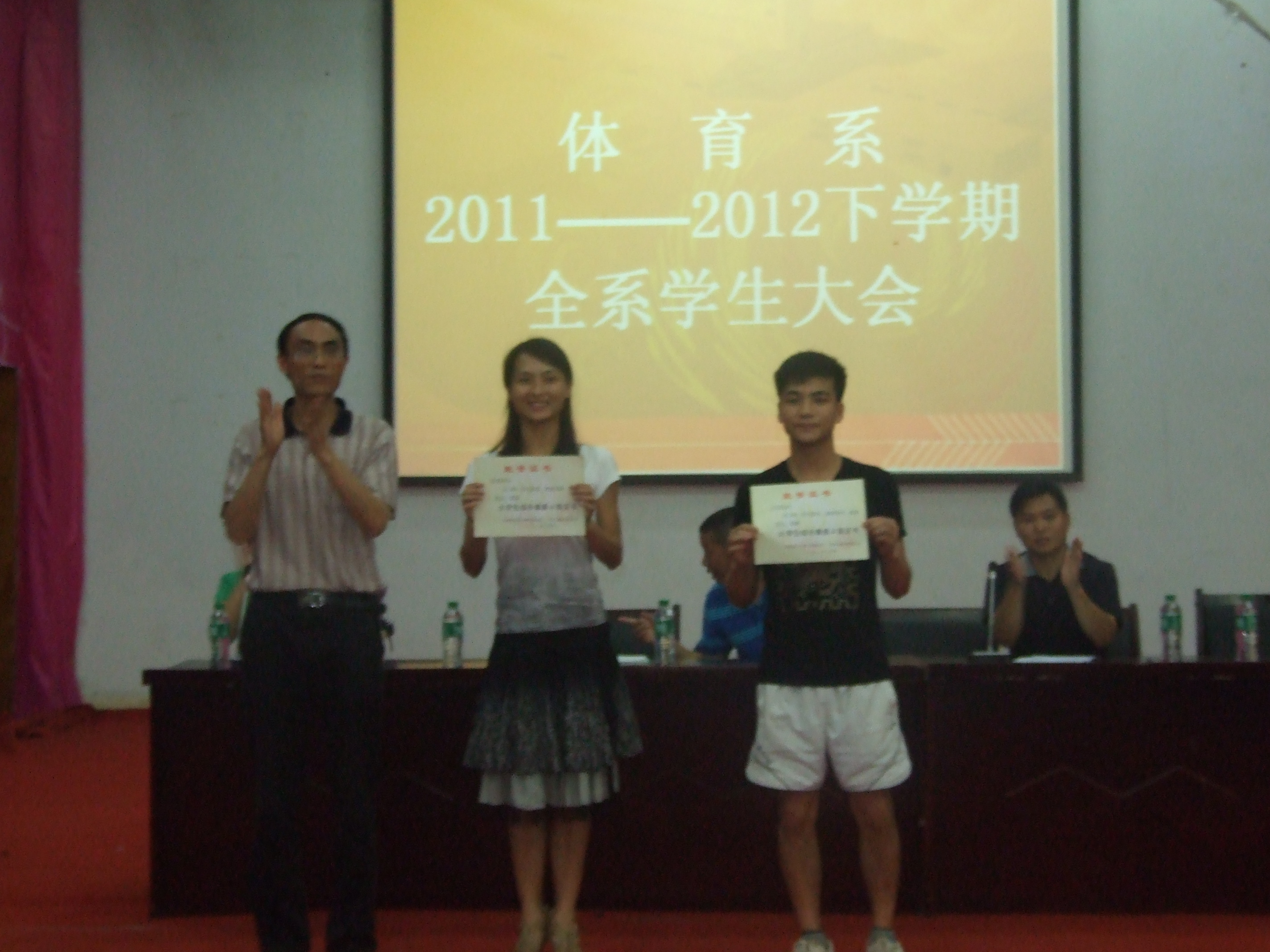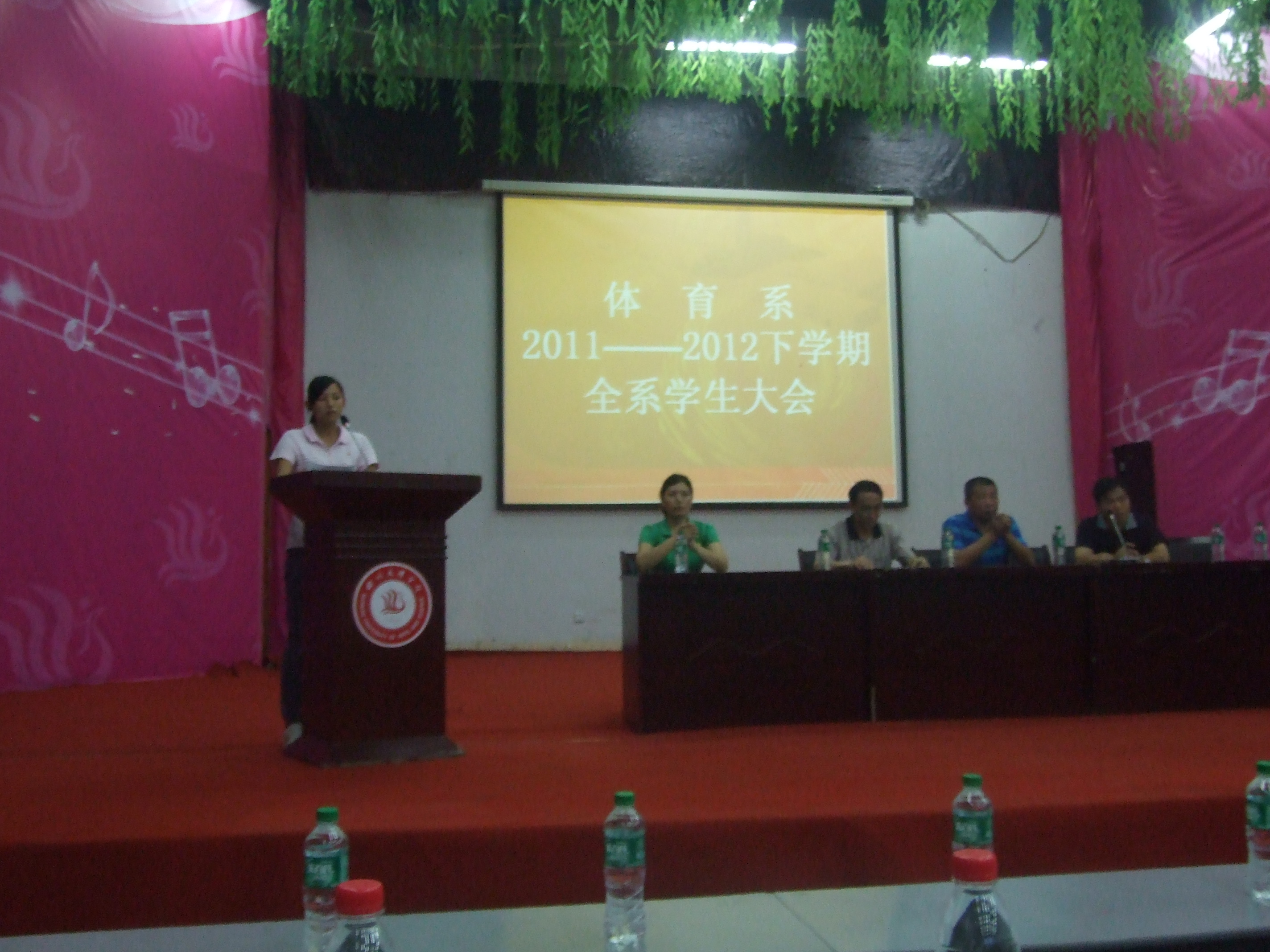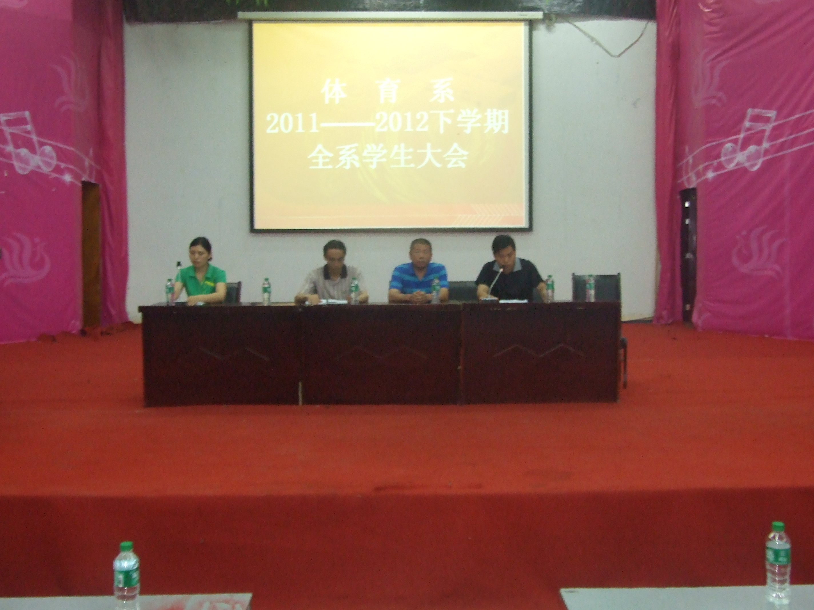 2012年6月10日晚上7点,体育系在莲湖校区126教室顺利召开2011-2012下学期学生教育总结大会。本次大会的召开主要是对本学期的学风建设、学生常规管理、安全教育、考风考纪做以总结。参加会议的有体育系主任董立教授、副主任陈碧述教授、党总支副书记张皓老师、那明明辅导员及班主任老师代表,全系近600名学生参加了本次总结大会。