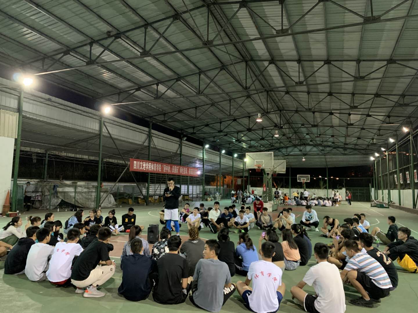 202092819时,2020级全体学生分别在体操房、篮球棚举行了“同一个中秋节,同一个家”的主题晚会活动,学院党总支副书记彭波、学工办老师、带班辅导员出席并组织了活动。体操房、篮球棚彩带飘扬,同学们席地围坐,品尝月饼,游戏互动,载歌载歌。大家在交流互动中,感受到了集体的温暖。