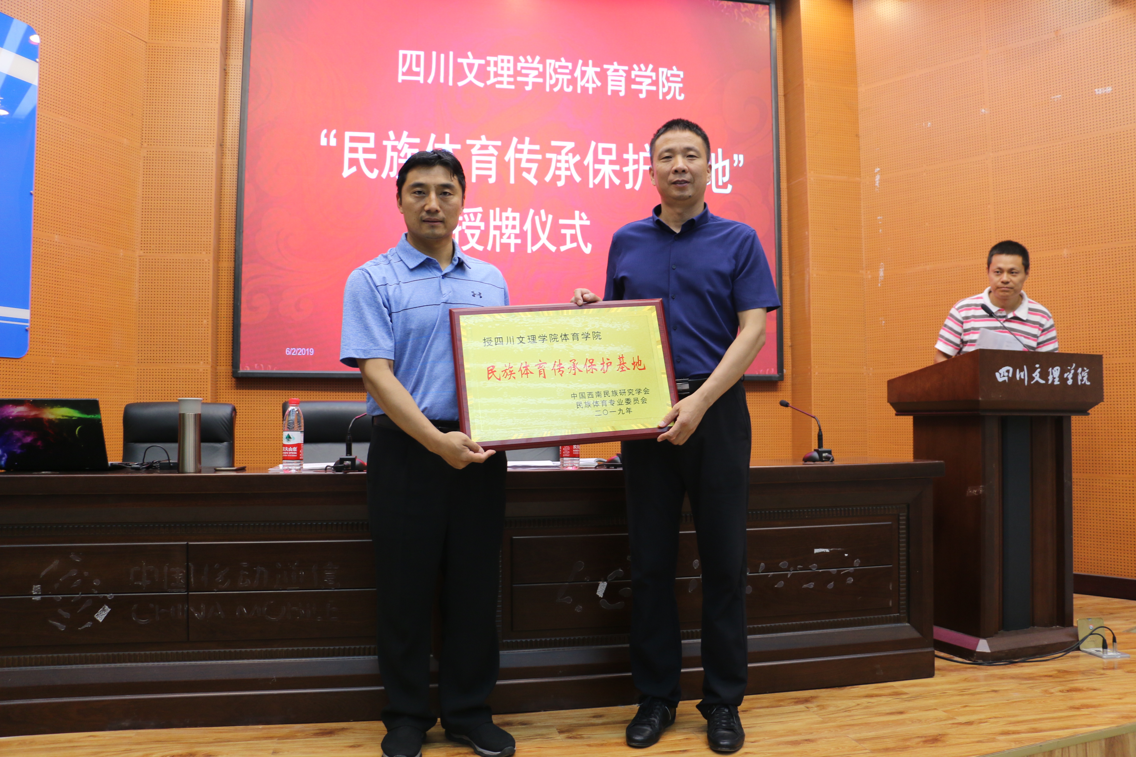 讲座伊始,首先进行“民族体育传承保护基地”授牌仪式,由成都永利3044集团官网陈振勇教授为我院院长佘涛教授授牌。其次,陈教授讲解了如何理解我们的民族传统体育文化,并分析了民族传统体育文化保护研究的领域等内容。最后,陈教授提出三点希望:一是希望同学们认真领会讲座内容;二是希望同学们积极的探索武术与民族传统体育的新模式新方向;三是希望同学们努力成为一名合格的武术专业人才。