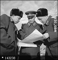 在解放一江山岛的战斗中,前线指挥员(华东军区参谋长张爱萍)亲临最前线,向某部指挥员指示工作