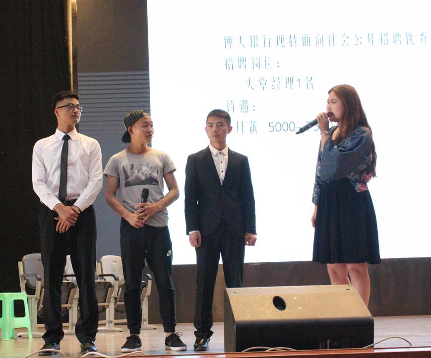 闭幕式上先进行的是职场竞聘观摩活动,X银行招聘大堂经理和Y私立中学校招聘体育教师的面试环节,三名同学模拟招聘面试考官,四名同学进行面试。同学们递交简历后,依次进入面试环节。面试后,由同学们发现问题,指出每名面试者表现好的方面与不足,此外还对应该怎样面试进行了深入交流与讨论。讨论后,那老师对面试者们做点评,并从简历的制作,面试前的准备给了同学们一些建议。