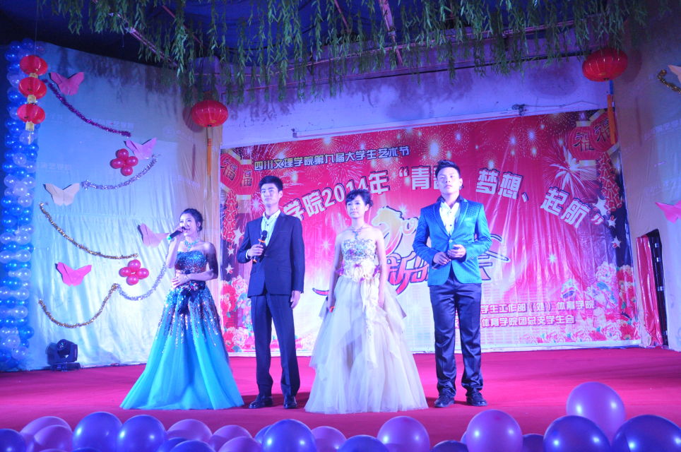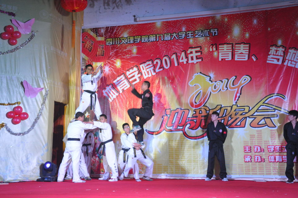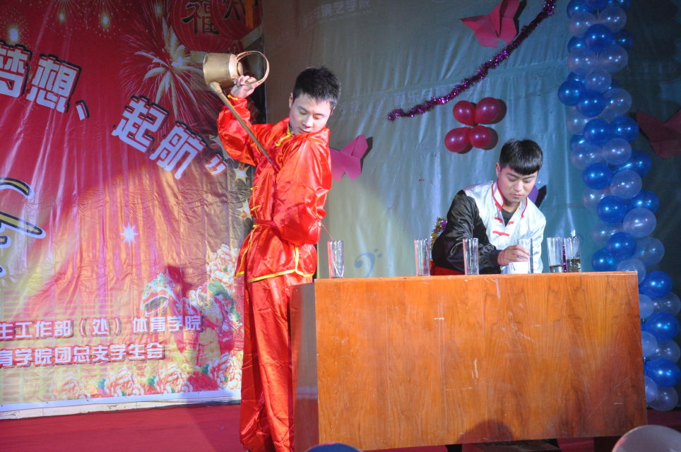 在绚丽的灯光和动感的开场舞过后主持人宣布晚会开始。晚会现场群星灿烂、激情荡漾,轻灵而娴熟的舞姿、动感而激情的节奏以及他们那与音乐完美的融合,展示了同学们积极向上的生活态度,感染着在场的所有观众,令人流连忘返。晚会更有武术、跆拳道的表演,将平时的训练成果向大家展示。《芭蕾》、《健美操》等有氧性舞蹈让在场观众感受到了青春的激情与活力。小品《他们的梦》改编来自学生之间的共同心声给观众带来了欢声笑语和无限的深思。更精彩的《跆拳道》、《中华武术》等节目,演员们深厚的功底和精彩的表演令台下观众为之叹服,也将晚会现场气氛一次有一次的推入高潮。