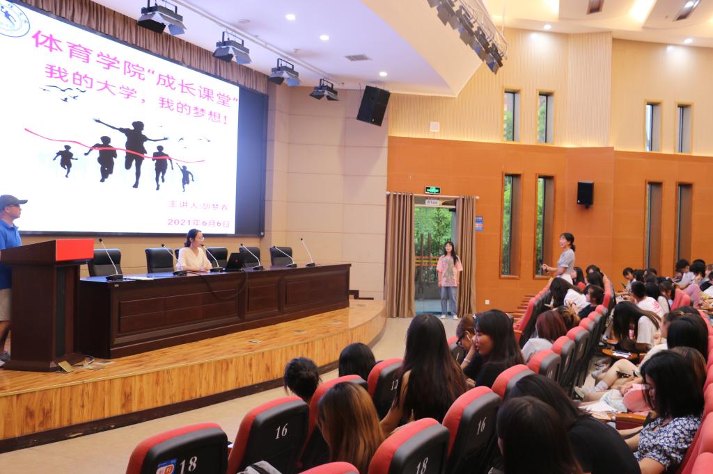 胡梦春为大家讲述了自己体育学习之路、考研奋斗历程。她谈到,在高中阶段一次偶然的机会,文化成绩较好的她成为了体育生。由于高考失利,刚进大学时自己情绪有些低落。后来在老师的引导下、师兄师姐关心下,她逐渐发现了文理校园的魅力,渐渐调整了心态,并且将精力慢慢转向了健美操专项学习。专项学习非常辛苦,但她一直坚持了下去。参加了许多国内健美操比赛,游历不少城市,拓展了视野,洗去了训练的艰辛,收获满满。她认真对待理论课程学习,总是坐在教室第一排,刻苦学习所学科目成为了常态和习惯。从未参加任何培训班,顺利通过了大学几乎所有专业过级考试。给自己压力,心怀梦想,坚持为理想而奋斗。当选择了考研,她就一刻没有停止过努力。尽管临时更换了学校、更换了备考内容,她仍然克服了困难,用辛勤努力实现了梦想,就如她所说到“这段时间很痛苦,但是很有意义。结果是美好的,我如愿的考上了”。她还现场回答了同学们提出的有关学习、考研和大学生活的问题。课堂上,胡梦春用流行时尚的网络词、幽默含蓄的话语、真切详实的个人经历,引起了听者的共鸣,给大家带来了一场成长的“盛宴”。