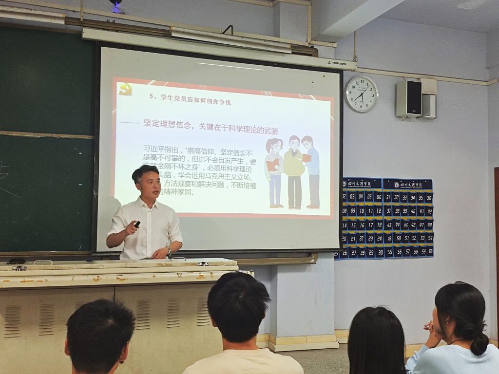 课堂上,靳书记还与同学们就党内相关理论知识进行互动问答和讨论。通过学习,同学们对习近平新时代中国特色社会主义思想有了更深刻的了解,为自己将来如何进一步树立好先锋模范作用起到了积极作用。