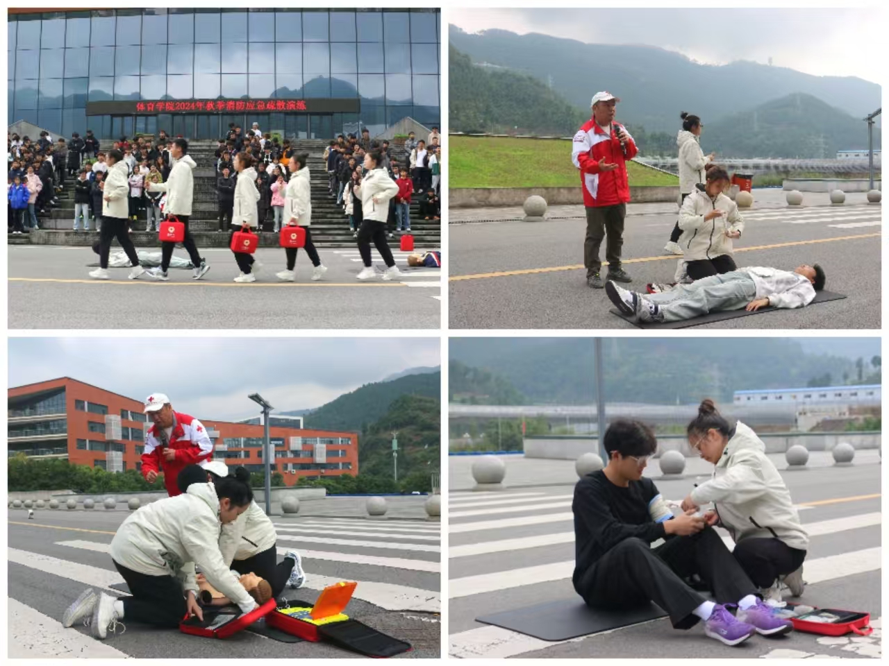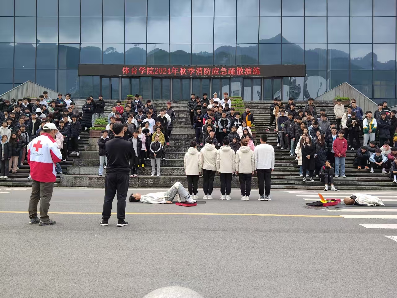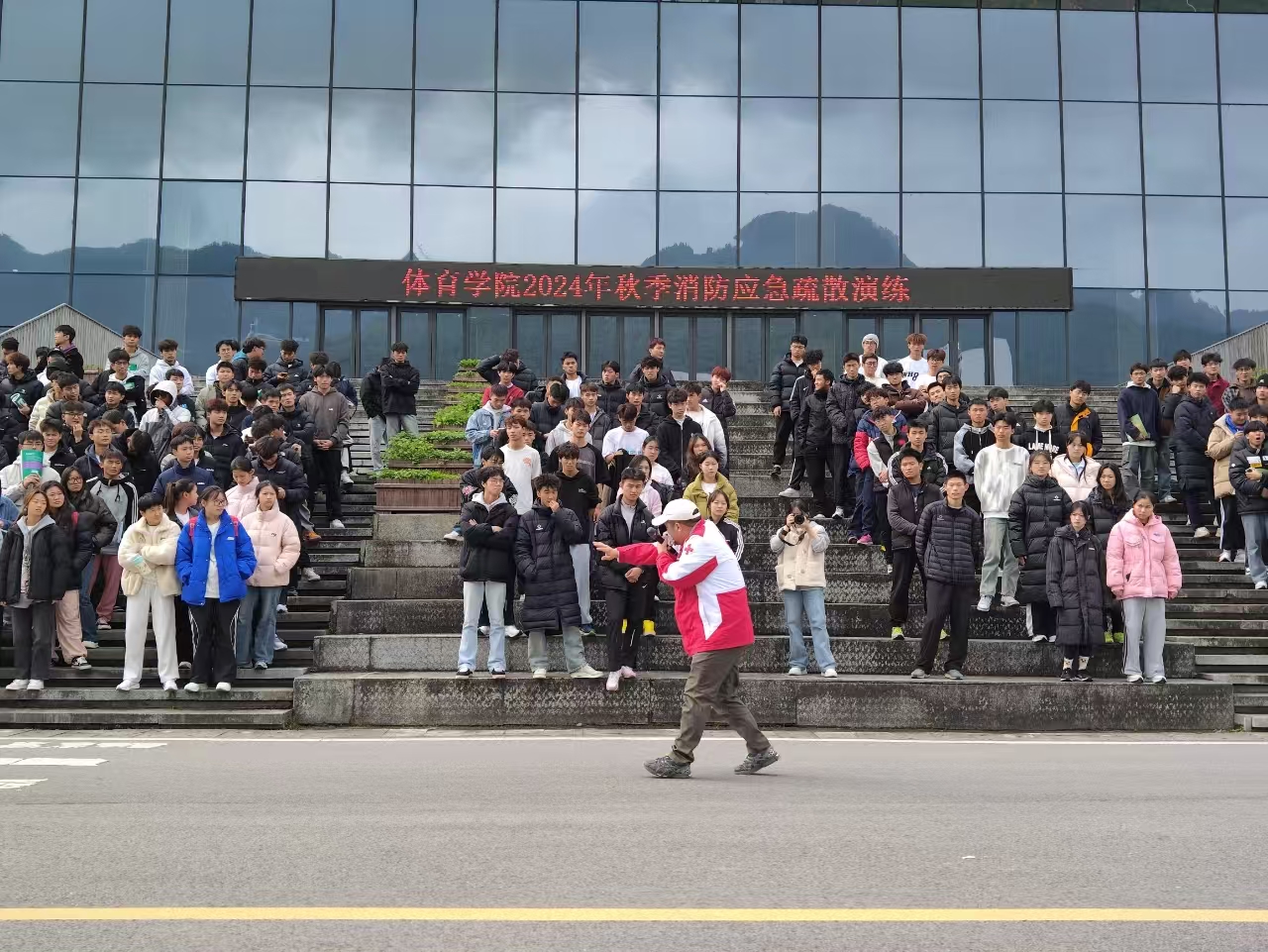 2024112212点整,永利3044集团官网于体育馆开展了消防应急疏散演练。学院党委副书记靳浪、辅导员邓超、李波、专任教师宋京林、7 名红十字救护员及2024 级全体学生参与此次活动。