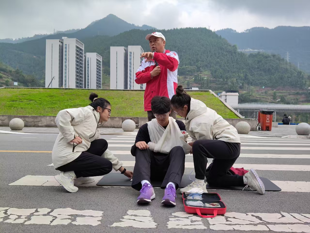 本次演练模拟建筑物火灾场景,警铃骤响后,学生们迅速反应,依指定路线从安全通道有序疏散至室外安全区域,整个过程紧凑高效、安全有序。随后,宋京林率红十字救护员团队进行了消防暨应急救护演练,内容包括上肢受伤、腹部受伤、心脏骤停等情况的应急处置,灭火器与消防水带的使用方法以及火灾逃生的基本常识。