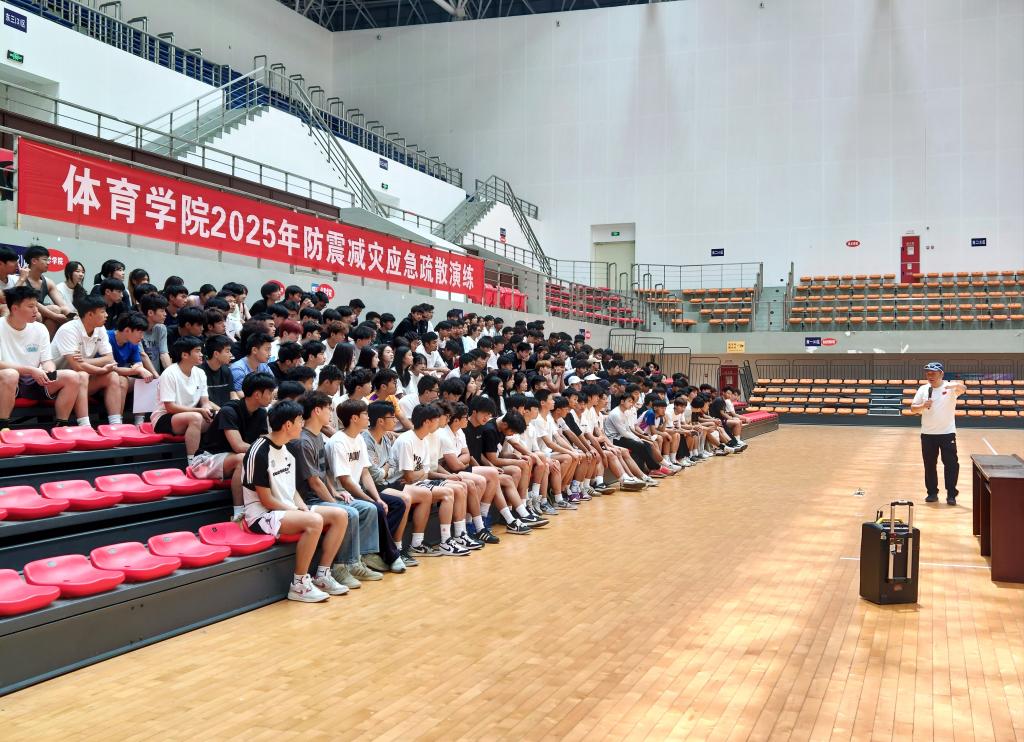 演练开始前,2024级全体学生准时在体育馆篮球馆集合。宋京林老师现场讲解并演示了地震避险与自救互救技巧,围绕“伏地、遮挡、手抓牢”等核心防护要领结合案例为同学们详细科普了地震逃生知识,并针对体育馆、教室等不同场景的逃生方案进行具体指导。
