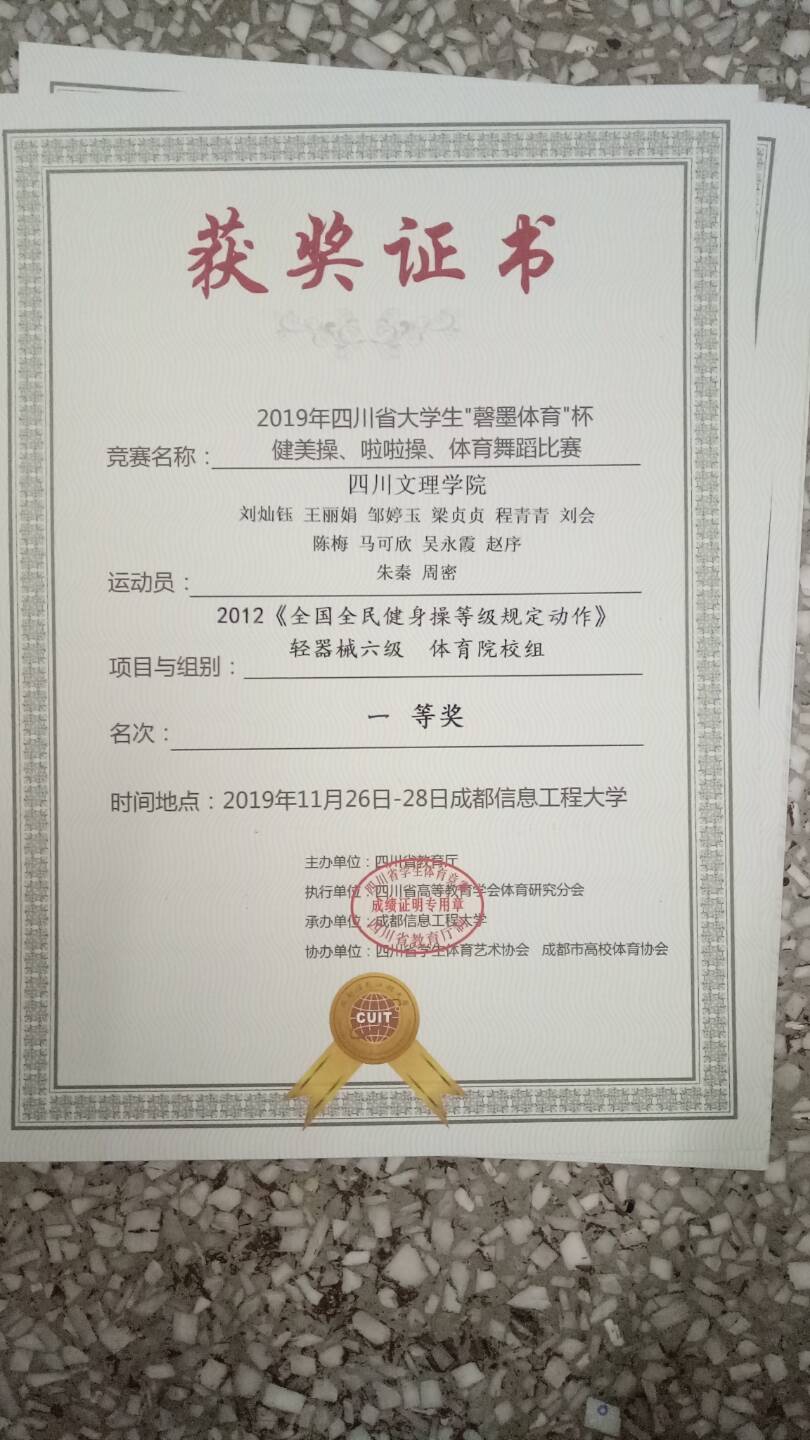 刘灿钰,王丽娟,邹婷玉等12位同学,与成都文理学院,而内江师范学院,阿坝师范学院进行了激烈的角逐最终获得2012《全国全民健身操等级规定动作》轻器械六级体育院校组一等奖。