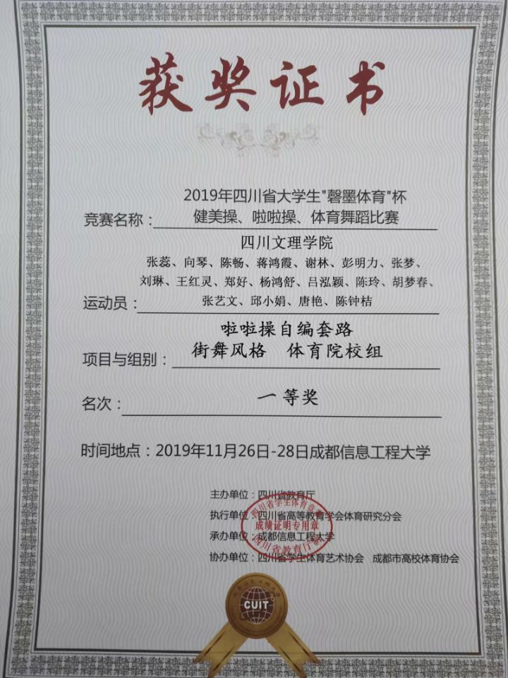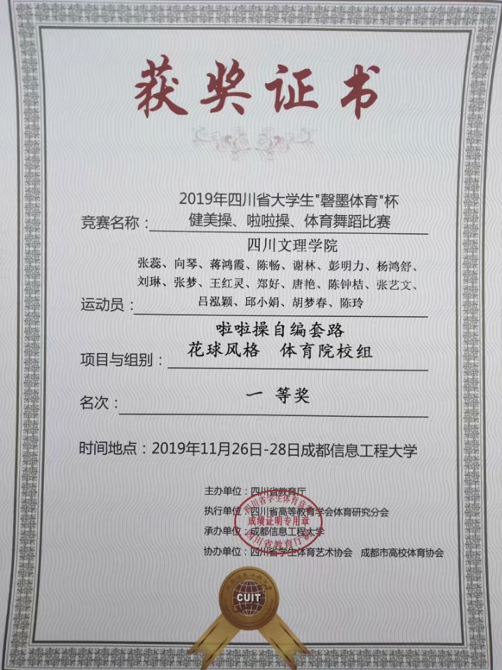 陈畅,张蕊,向琴,刘琳等18位同学,在与内江师范学院,成都文理学院,宜宾学院等学校同台竞最终获得体育院校组啦啦操自编街舞中获得一等奖和体育院校组啦啦操自编花球一等奖。